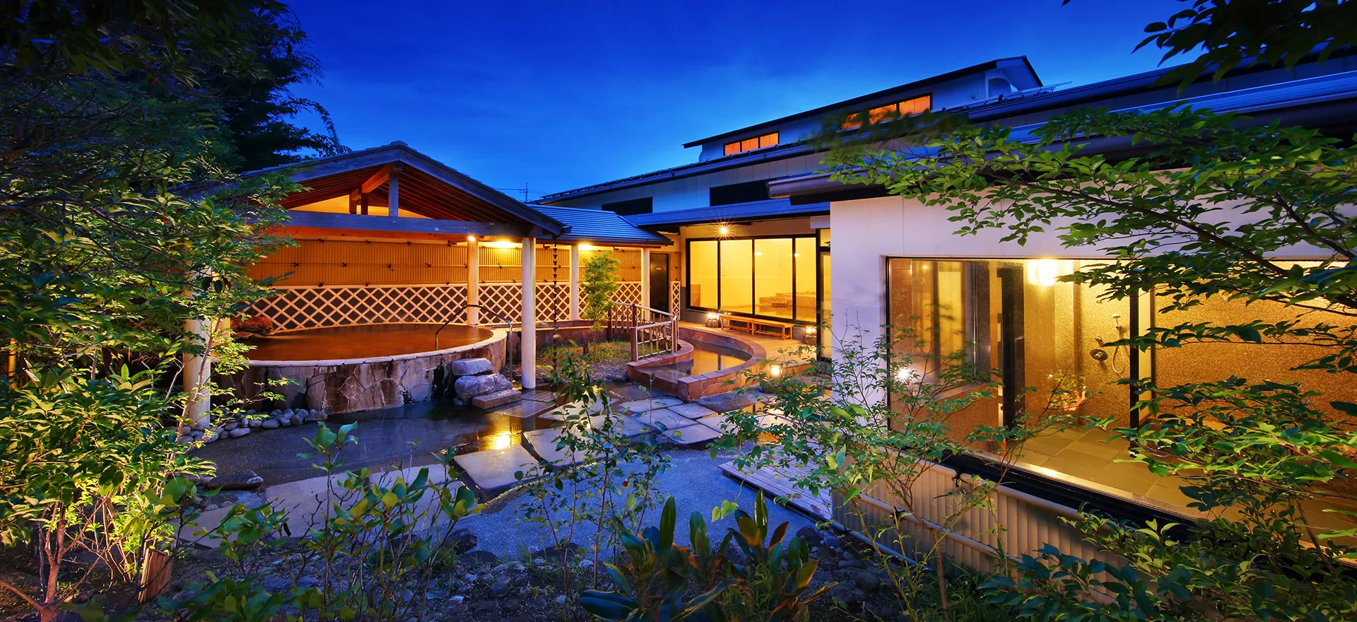 美しい庭園の中の露天風呂。美容効果で人気の高濃度炭酸泉をはじめ、水流や泡の刺激で身体をほぐしてくれるバブル&ジェットバス、玉石を敷き詰めた足つぼ湯、ゆったりとしたサウナルームなど。(▼ 温泉のページ 詳細情報 )